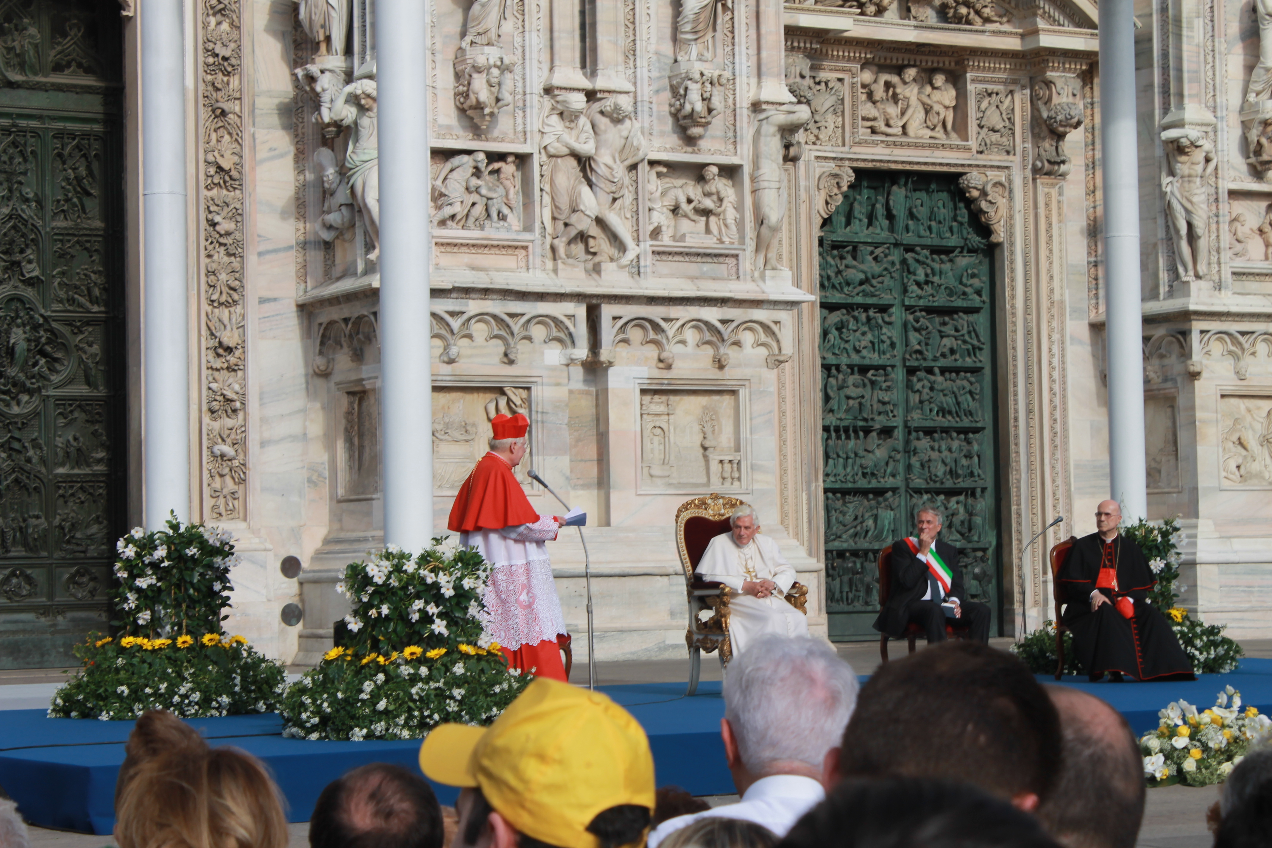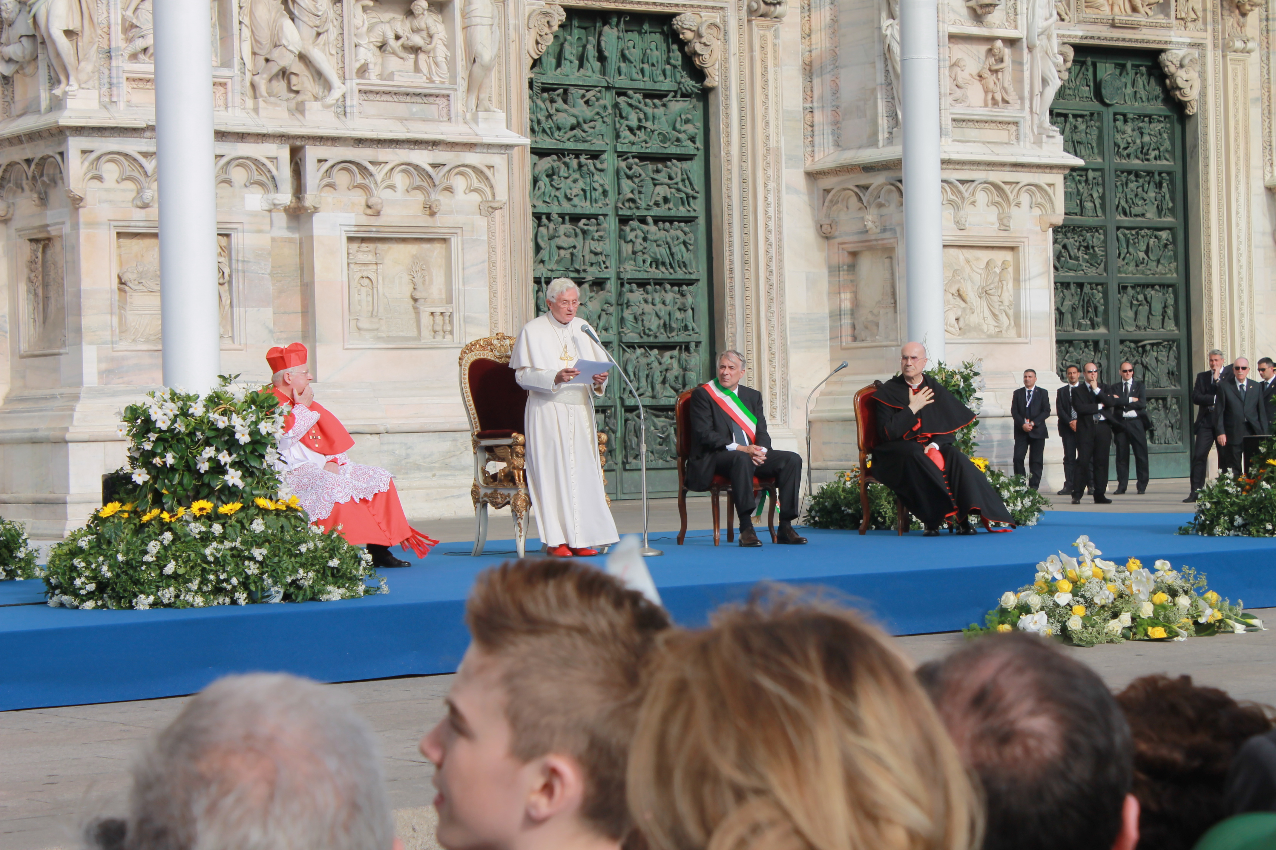 Il Pontefice si è poi recato in Piazza Duomo, attraversando le strade principali della città, dove ha rivolto il suo saluto, dopo il discorso d’accoglienza del sindaco Giuliano Pisapia e dell’arcivescovo Angelo Scola.
