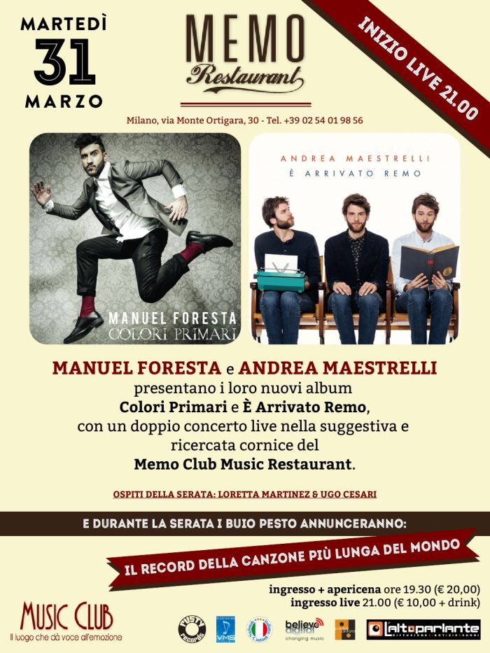 Martedì 31 marzo presso il Memo Restaurant Music Club di MILANO (Via Monte Ortigara 30 – inizio serata ore 21.00 – a partire da 10.00 euro), il cantautore toscano ANDREA MAESTRELLI e il cantante salernitano MANUEL FORESTA presenteranno in anteprima i loro dischi d’esordio, entrambi disponibili nei negozi tradizionali, in digital download e sulle piattaforme streaming dal 7 aprile.