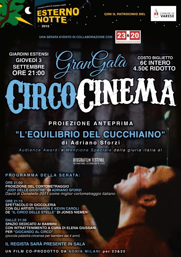 “Sono estremamente orgogliosa e onorata dell’opportunità offertami da FilmStudio 90 e dal prestigio di questa proiezione” dichiara Sonia Milani titolare di 23&20 e co-produttrice del film “Per me sarà l’occasione di far conoscere alla mia città un lavoro che ho amato fin dal primo frame e in cui ho creduto fortemente, Sarà una bella serata, per tutta la famiglia, perché abbiamo pensato anche ai bambini, che potranno essere coinvolti in una festa che li trascinerà ed avvolgerà nel mondo del circo: verrà infatti proiettato anche “Jody delle giostre”, un cortometraggio sempre di Adriano Sforzi, che ha vinto il David di Donatello come miglior cortometraggio italiano nel 2011, poi ci saranno dei fantastici giocolieri de “Il circo delle stelle” che si esibiranno sul palco prima della proiezione e, dalle 21:30, per i bambini uno spazio a loro dedicato con un “assaggio di circo”, mentre i genitori potranno godersi la proiezione de “l’equilibrio del cucchiaino”, 62’ di storia intensa ed emozionante. Una serata speciale da non perdere, avvolti nella meravigliosa cornice dei nostri giardini Estensi.