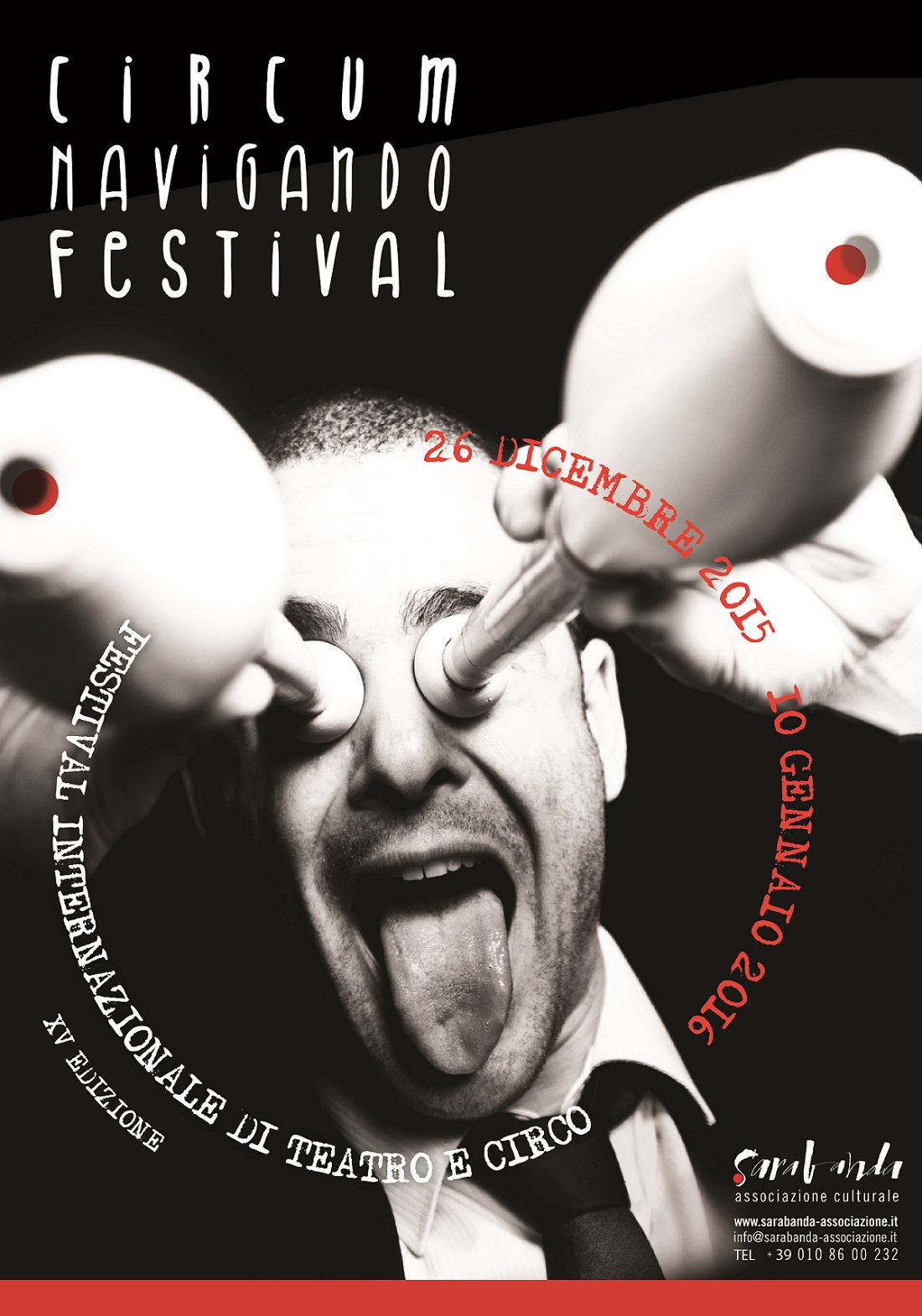 Circumnavigando Festival Internazionale di Teatro e Circo (http://bit.ly/circumnavigando), ritorna a Genova dal 26 dicembre 2015 al 10 gennaio 2016 per la 15^ edizione. Una manifestazione esplosiva e coinvolgente, che porterà il meglio del Circo Contemporaneo da tutto il mondo nel centro di Genova durante le vacanze natalizie, con una grande festa di Capodanno sotto al tendone da circo allestito al Porto Antico, in Area Mandraccio.