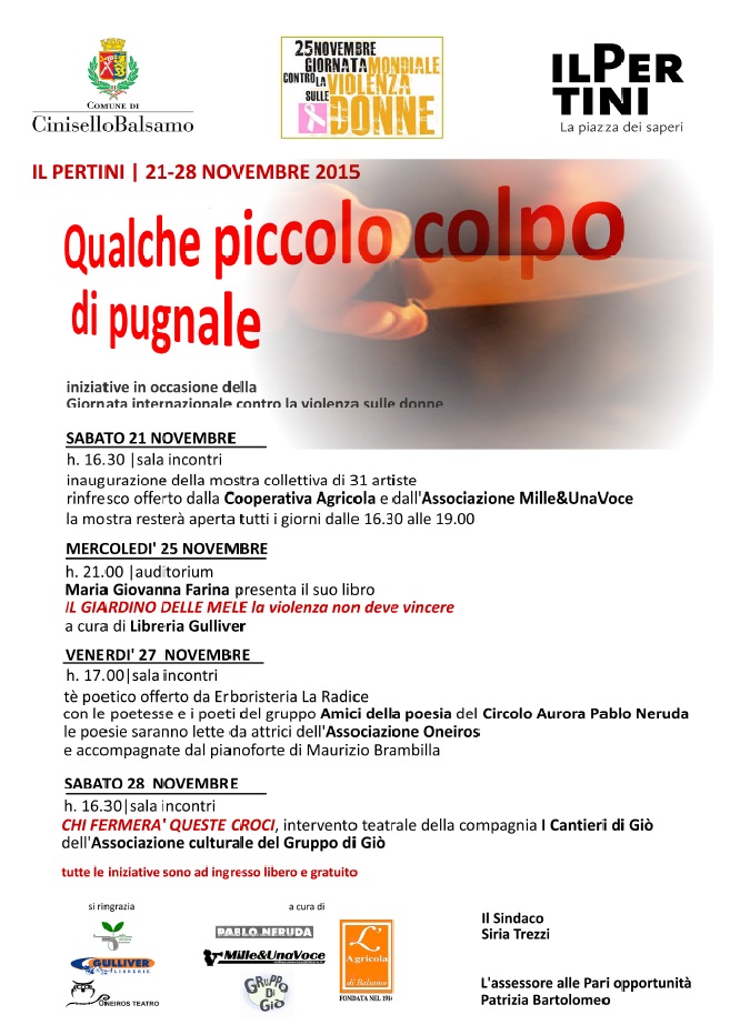 L’associazione Mille&unavoce presenta la mostra collettiva di 31 artiste  “Qualche piccolo colpo di pugnale” organizzata con  l’Amministrazione comunale e con le Associazioni Agricola e Pablo Neruda.