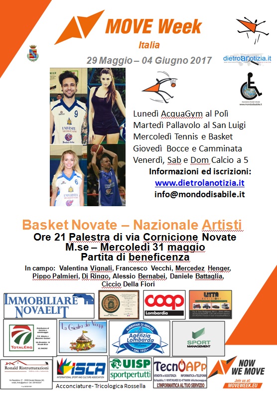 Sera: Partita Basket tra persone di Novate e nazionale Basket Artisti. Ore 21 presso palestra di via Cornicione Novate.