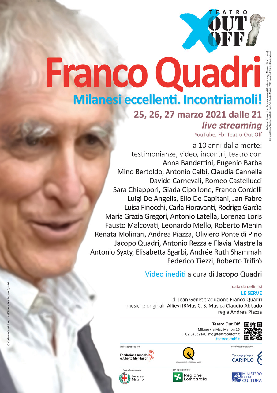 Dal 25 al 27 marzo 2021 dalle ore 21 realizzeremo tre appuntamenti dedicati a Franco Quadri live streaming dal teatro out off che trasmetteremo sui canali youtube e facebook.