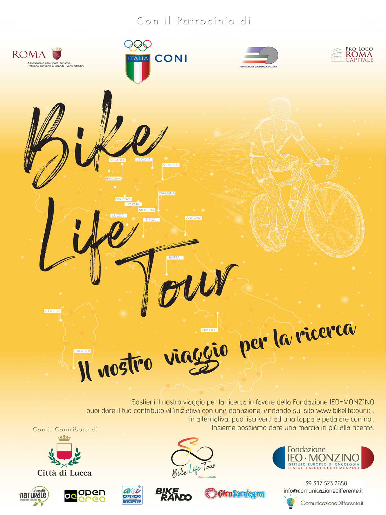 ll progetto sportivo e benefico ‘BikeLifeTour #solocosebelle’ 2021, patrocinato dal Coni, dalla Federazione Ciclistica Italiana, dal Comune di Roma, dalla Pro Loco di Roma Capitale e con il contributo del Comune di Lucca, è una nobile avventura ciclistica di circa 2600 km.