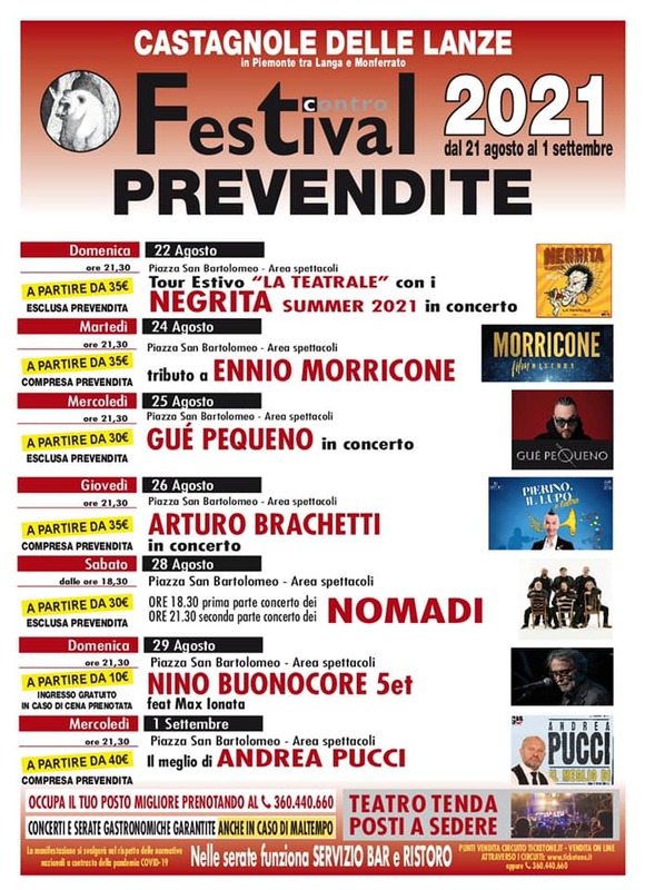 Si comincia sabato 21 agosto con un gruppo che è diventato ospite fisso del Festival, la Shary band e si prosegue domenica 22 agosto con il grande ritorno dei Negrita sul palco di Castagnole. Martedì 24 agosto in concerto l’orchestra di Ennio Morricone, mentre nella serata di mercoledì 25 agosto arriva a scaldare il palco il rapper italiano Gue Pequeno. Il 26 agosto Arturo Brachetti si esibirà insieme alla Ensemble Symphony Orchestra. Due, come d’abitudine, le serate dedicate a I Nomadi col 30° Raduno Estivo Nomadi Fans Club che anticipa il doppio concerto di Sabato 28 agosto. Doppio anche l’appuntamento con la 162^ edizione della Fiera della nocciola domenica 29 e lunedì 30 agosto. Martedì 31, tornano altri amici del Festival Contro e si rinnova la serata di musica occitana con Lou Dalfin. A chiudere il Festival il 1^ settembre sarà il comico Andrea Pucci. Quest’anno il divertimento sarà assicurato anche in caso di maltempo grazie al teatro tenda di ben 2000 mq.