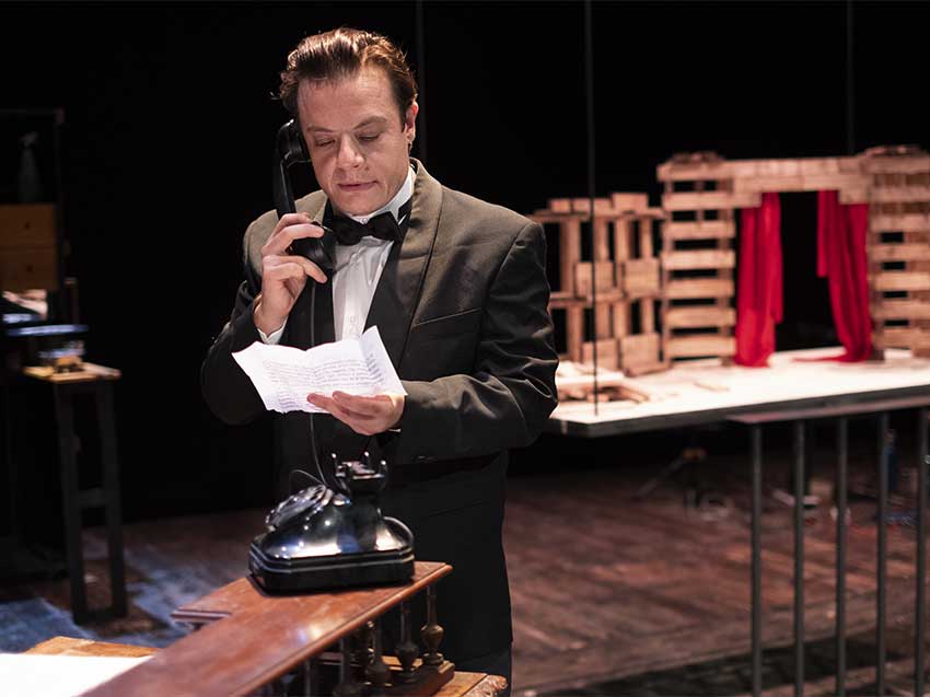 In questo “assolo con musica”, Lino Musella darà dunque voce e corpo alle parole che Eduardo rivolge, ad esempio, alle Istituzioni, sia negli scritti che indirizza nell’ottobre del 1959 al Ministro del Turismo e Spettacolo (Umberto Tupini) sia quando nel 1982 a Palazzo Madama si rivolge direttamente ai suoi colleghi senatori, ma anche note private riferite ai suoi sodali (come quelle dei carteggi relativi all’impresa estenuante per la ricostruzione e il mantenimento del Teatro San Ferdinando) e alcuni estratti di articoli di giornali, a sua firma o a lui riferiti.