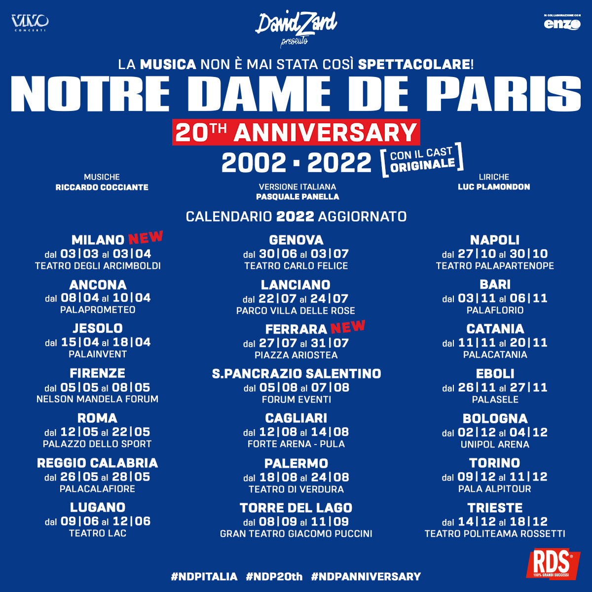 A pochi giorni dalla partenza del tour che celebrerà i vent’anni di storia di NOTRE DAME DE PARIS in Italia, l’opera popolare moderna più famosa al mondo e spettacolo tra i più imponenti mai realizzati, si aggiungono nuove repliche a Milano e Ferrara.
