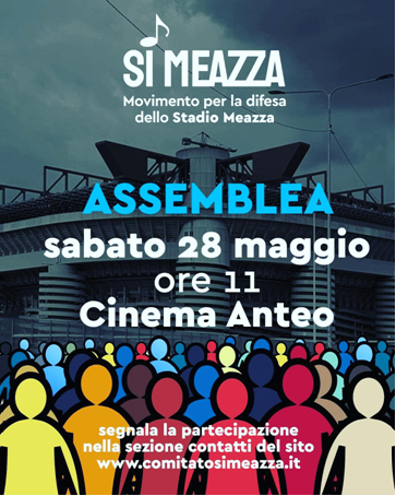 Il Comitato Sì Meazza si riunirà in assemblea sabato 28 maggio alle 11 all’ Anteo Palazzo del Cinema (g.c.) in piazza XXV Aprile per avanzare nuove proposte che sblocchino la situazione surreale della vicenda San Siro.
