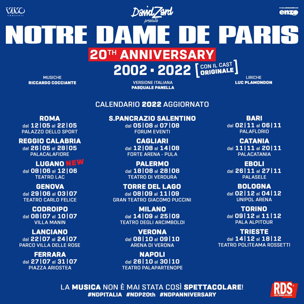 A vent’anni dall’esordio dell’opera sui palchi d’Italia il 14 marzo del 2002 al GranTeatro di Roma Notre Dame de Paris ha in scena l’intero cast originale del debutto. Inoltre, special guest d’eccezione di alcune delle date speciali del tour saranno Claudia D’Ottavi e Marco Guerzoni, nelle vesti di Fiordaliso e Clopin, di cui sono stati i primi interpreti nel 2002.