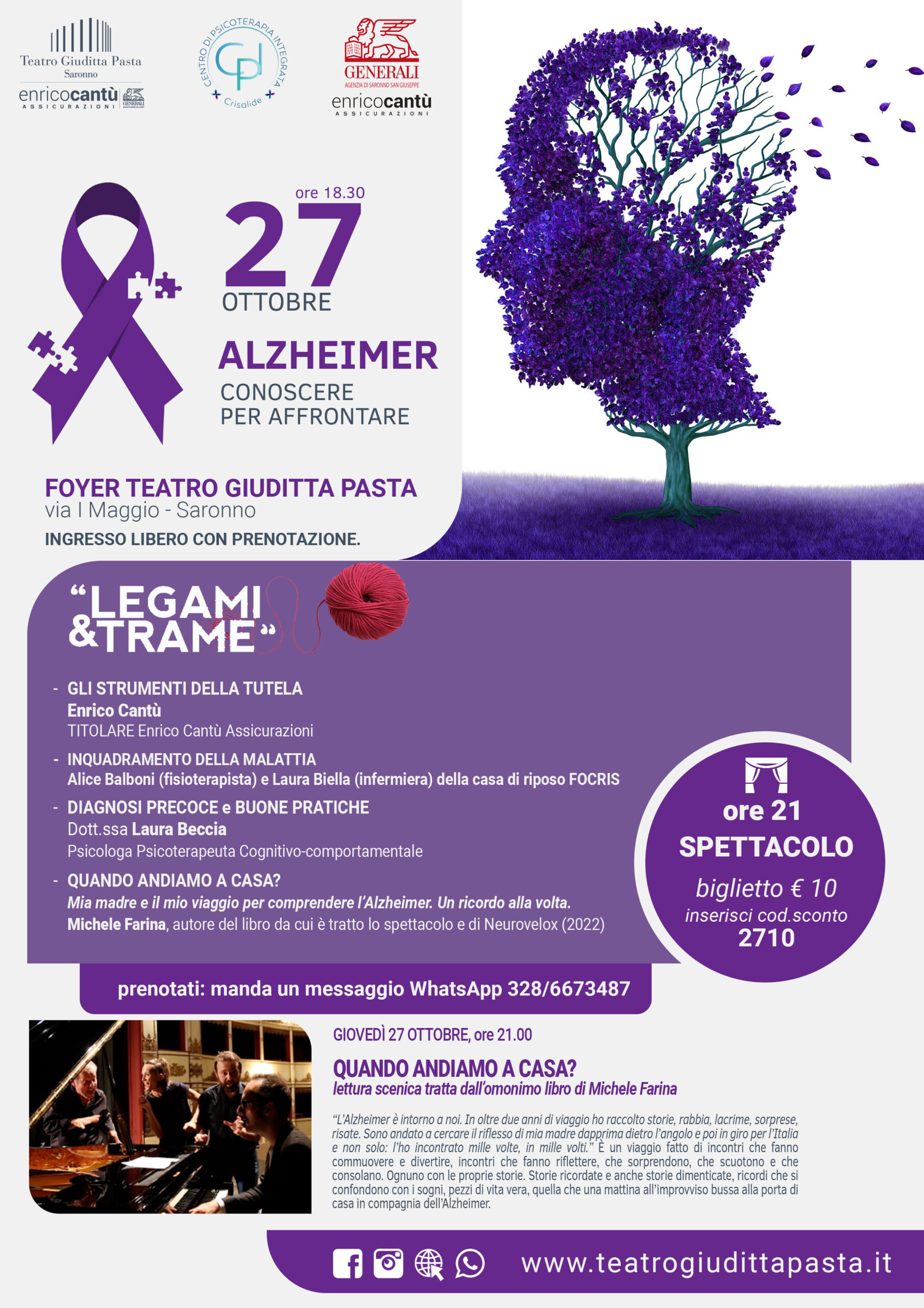 Lo spettacolo è preceduto alle ore 18.30 da un incontro di approfondimento sull’Alzheimer organizzato in collaborazione con il main sponsor del teatro di Saronno: Enrico Cantù Assicurazioni.