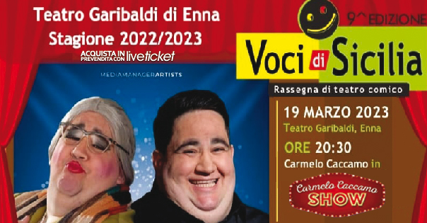 Domenica 19 marzo si alzerà il sipario sull’esilarante comicità di Carmelo Caccamo. Sarà la dissacrante ironia dell’artista catanese ad animare il pubblico dello splendido Teatro Garibaldi con il “Carmelo Caccamo show”. Prodotto da Media Manager, lo spettacolo impreziosisce la 9ª edizione di Voci di Sicilia. Una rassegna organizzata da Eventi Olimpo con la direzione artistica di Peppe Truscia e il patrocinio dell’amministrazione comunale di Enna.