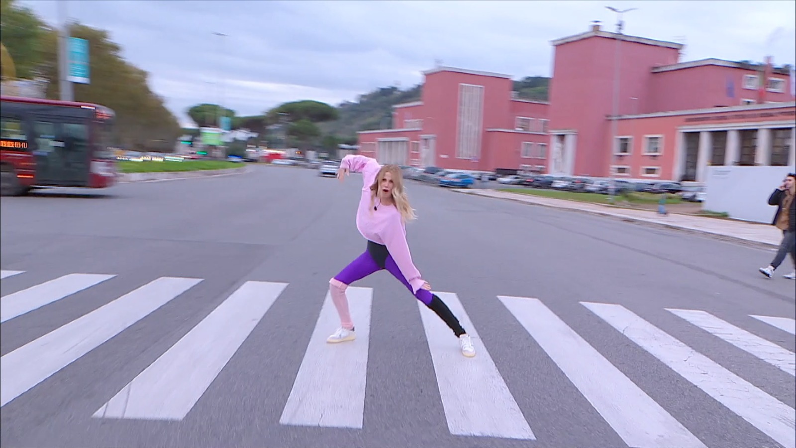 In outfit ‘sporty street’ tipico di quegli anni, completo di felpa oversize rosa, body, scaldamuscoli e fuseaux dai coloro fluo, la Marcuzzi ha dato vita ad un’esibizione energica e sfrenata. Addirittura, ad un certo punto in nome dell’esibizione si è vista sdraiarsi sul parabrezza di un furgone fermo al semaforo, tra gli applausi di Fiorello, Biggio, Casciari e di tutta la banda.