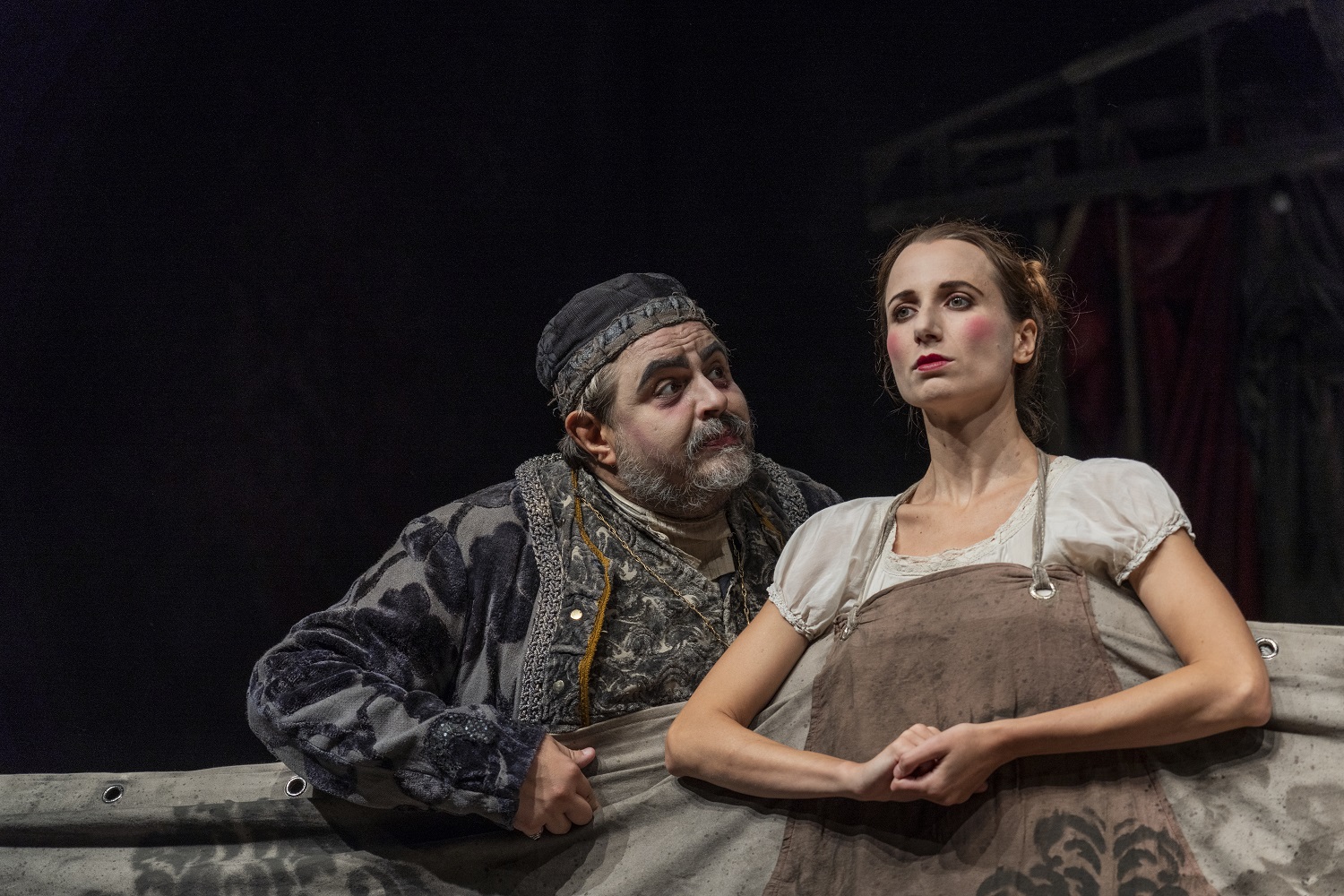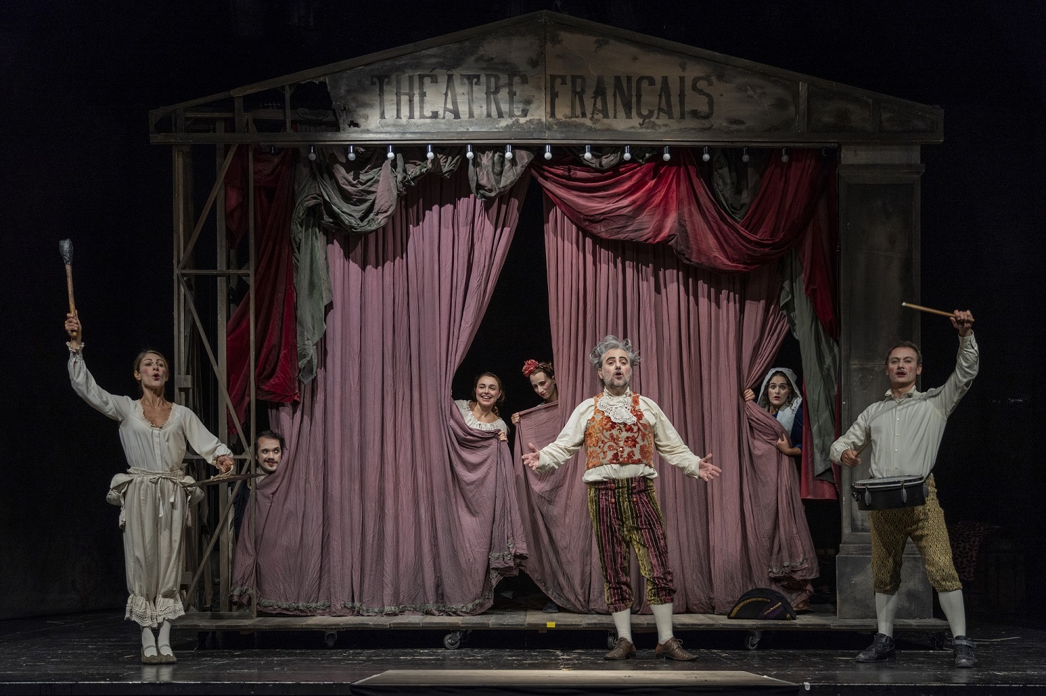 Nella cornice di un teatrino mobile e decadente si rappresenta dunque L’avaro, recitato coralmente da un gruppo di guitti in un susseguirsi ritmico e dinamico di scene e controscene, in cui tutti i personaggi sono coinvolti in una congiura contro l’avaro e l’avarizia.