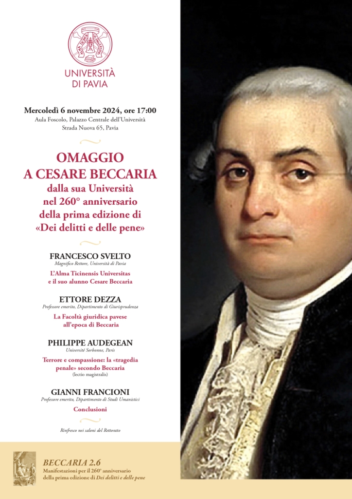 Con un Omaggio a Beccaria dalla sua Università (6 novembre, Aula Foscolo, ore 17, con interventi del Magnifico Rettore, Francesco Svelto, e dei professori Ettore Dezza, Philippe Audegean e Gianni Francioni), l’Università di Pavia rivendica alla sua storia ultracentenaria la presenza di un eccezionale studente, Cesare Beccaria (1738-1794), di cui quest’anno ricorre il 230° della morte e il 260° della pubblicazione della prima edizione di Dei delitti e delle pene, uscita anonima a Livorno nel luglio 1764.
