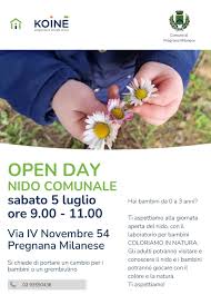 “Hai bambini da 0 a 3 anni? Ti aspettiamo alla giornata aperta del nido comunale di Pregnana Milanese, con il laboratorio per bambini COLORIAMO IN NATURA. Gli adulti potranno visitare e conoscere il nido e i bambini potranno giocare con il colore e la natura.