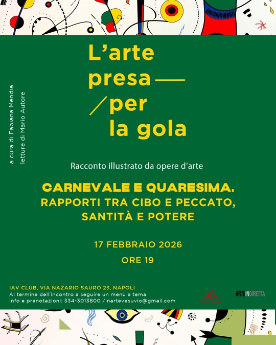 Arte, cibo e letteratura per la prima volta in un unico filone creativo, martedì 17 febbraio start ore 19:00 presso il polo artistico, culturale e d’intrattenimento IAV Club “In Arte Vesuvio” delle sorelle Andolfo, sito in Napoli alla via Nazaria Sauro, 23.