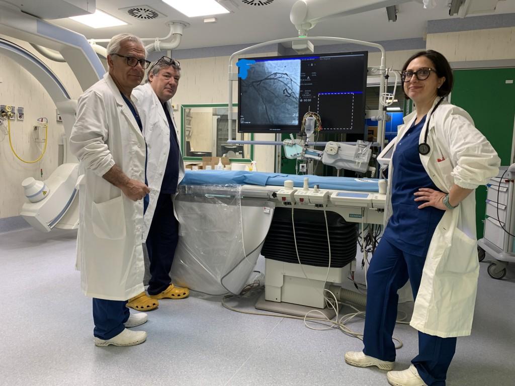 “Chiudiamo l’auricola per ridurre il rischio cardio embolico – spiega il direttore della Cardiologia Giuseppe De Angelis – Utilizziamo questa metodica quando è l’unica chance che abbiamo per curare pazienti molto fragili, che hanno insufficienza renale acuta, patologie gastrointestinali e altro che li espongono ad alto rischio di sanguinamento. La chiusura viene fatta in sala di emodinamica con sedazione profonda praticata dall’anestesista, con la presenza di due emodinamisti, 2 ecografisti che guidano gli emodinamisti con l’ecografia transesofagea, 3 infermieri e uno specialist che concorre per la sua esperienza multicentrica nello scegliere la protesi più appropriata per il caso.