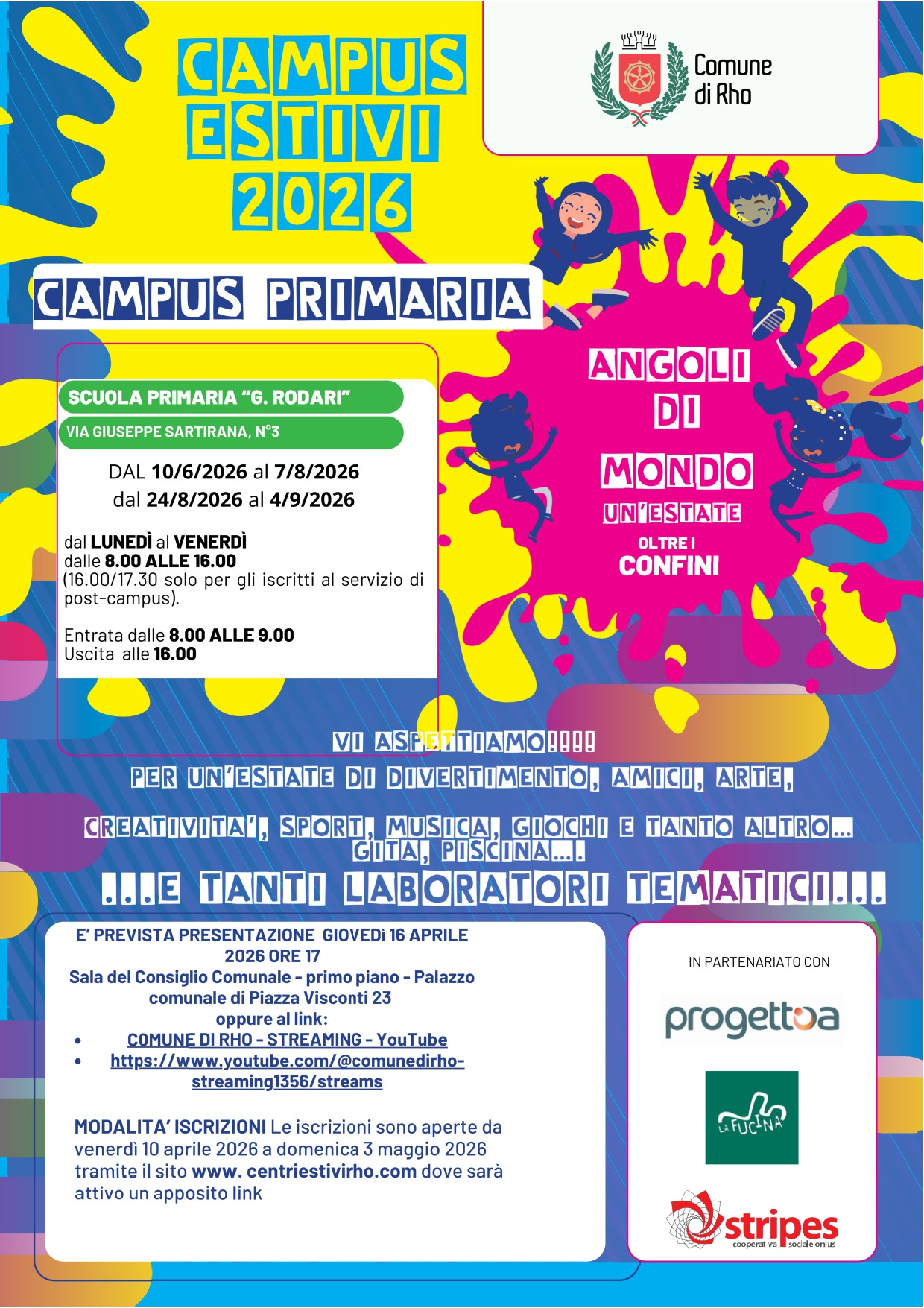 Le iscrizioni sono aperte fino a domenica 3 maggio tramite il sito www.centriestivirho.com dove sarà attivo un apposito link.